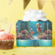 Submarino, cavalo marinho e tartaruga-do-mar vestem os chapéus de Santa cercados por peixes-palhaço e recifes de coral decorados com ornamentos festivos