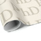 PhD empacotando papel em khaki bronzeado com palavras marrons claras. A palavra PhD repete-se em um padrão ao longo do comprimento deste papel de embalagem.