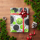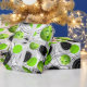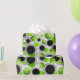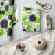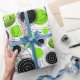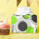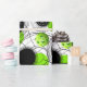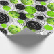 Um design bonitinho mostrando um padrão de bolas de picles verdes neonatais cercadas por círculos espiralados em preto e branco.