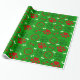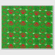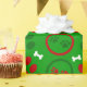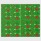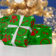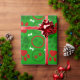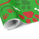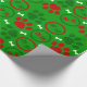 Papel de embrulho de Natal vermelho, branco e verde, brilhante, com pata de cão e ossos de cão em fundo verde.