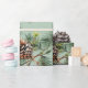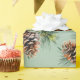 Um papel elegante e sofisticado de embalagem de férias, que inclui uma faixa branca de pinheiros na diagonal carregada de cones de pínus robustos contra um fundo verde-sábio.