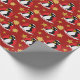 Papel de embrulho de Natal com ilustração de um pinguim criado fofo com um chapéu vermelho de Santa; design de animação de Natal para crianças; design de animação de Natal para crianças, em fundo vermelho com modelo de texto personalizável para seu nome ou mensagem; ilustrado por Radka Kavalcova