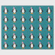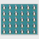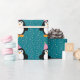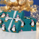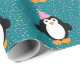 Pinguim de desenho animado bonito vestindo um chapéu de festa com um papel de embrulho de fundo confetti.