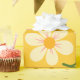 The design contains large pink flowers with soft rounded petals and a dark dotted center, surrounded by smaller flowers in orange and light cream colors. Slender branches with smooth green leaves connect the floral elements and add a natural flow. Small circular dots are scattered throughout the design, giving a light and cheerful touch. The background is a bright yellow tone that enhances the warm colors of the flowers and leaves. The overall style is simple and friendly, using flat shapes and clean colors to create a lively floral pattern.