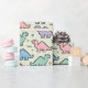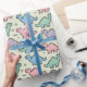 Este papel de embrulho personalizado, lúdico e nostálgico apresenta um padrão de silhuetas de dinossauros fofinhos e pixelizados em cores de arco macia e pastel dos anos 90, como verde-menta, azul-bebê, rosa pastel e matizes lavandas, criando uma estética divertida e gentil.