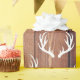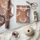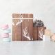 Papel de embrulho em madeira, de cor branca, com um padrão de chifres. O fundo é um design de tábuas de madeira de campo escuro.