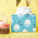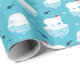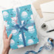 Playful polar bears in Santa hats float on icy blue seas surrounded by igloos, fish, and snowflakes. A cool Christmas favorite.
