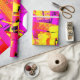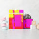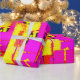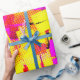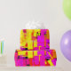 Este papel de embrulho audacioso fará com que seus presentes pareçam um canhão de confetti. Tons cor-de-rosa, vermelhos e amarelos se pop contra um fundo preto.