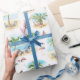 Este papel de embrulho de Natal tropical festivo apresenta um padrão de cenas de praia de férias com palmeiras decoradas com cordas coloridas e cadeiras de praia olhando para a água, intercaladas com flamingos cor-de-rosa em chapéus de Santa, e gaivotas entadas em estacas decoradas.