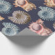 As conchas alveolares motif embrulham papel com cascas em espiral azuis e castanhas, bem como conchas cor-de-rosa e amarela. design costeira de excelente.