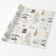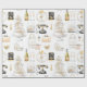 Papel de embrulho listrado apresenta magnólias, itens de presente de noiva preto, dourado e creme.