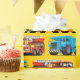 Um caminhão de descarregador, um trator, um carro de bombeiros vermelho grande e um escavador amarelo. Todos os tipos de caminhões da construção. Maravilhoso para sua festa de aniversário temático idosa do caminhão da construção do filho ou do neto. Escolha sua própria cor do fundo escolhendo "personalizam"/"editam"/"fundo" para escolher sua cor favorita do fundo, ou deixam-no com este fundo amarelo alegre.