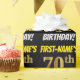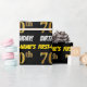 Este design de papel de embrulho apresenta uma mensagem como "PRIMEIRO NOME DO 70 DE ANIVERSÁRIO!", com o "70" a ter uma aparência falsa/imitada de cor dourada, e com o nome e "ANIVERSÁRIO" numa letra divertida e ousada. O nome é personalizável e o fundo é preto colorido. Um papel de embrulho como este poderia talvez ser usado no embrulho de presentes de aniversário que são dados a alguém em comemoração de seu setuagésimo aniversário. [~Z0000203]