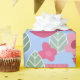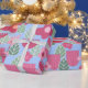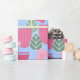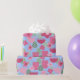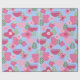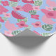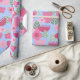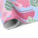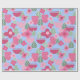 Este papel de embrulho tem um design escandinavo de flores e folhas em vários tons de rosa e verde em um campo de azul.