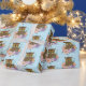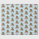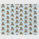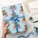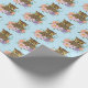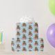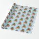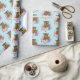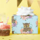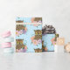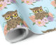 Coruja-marrom-branca sentada entre o rosa pastel, a pêssego e as flores roxas contra o fundo azul-claro