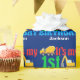 Legal papel azul de embrulho de primeiro aniversario para veículos de construção para uma criança que gosta de carros e caminhões. Adicione o nome do seu filho a azul abaixo do digger fofo e do design de um caminhão para uma criança que gosta de veículos.