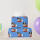 Cãozinho de Papillon bonito vestindo um design de vestido de Natal colorido. As pegadas de ouros e lindas cores azuis gradientes decoram o fundo.