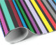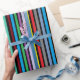 Aniversário presente embrulhe com listras vermelhas, azuis, roxas, verdes, laranja, limão e amarelas.