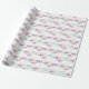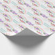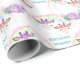 Duas caras sorridentes de girafa, uma vestindo flores roxas e a outra vestindo flores rosa, estão logo abaixo de um brilhante arco-íris multicolorido neste papel de embrulho de presente de aniversário. Adicione uma lavanda e um buquê roxo e o seu texto personalizado em negrito, e colocado sobre um fundo branco, você tem um papel de empacotamento bonito para praticamente qualquer um.