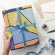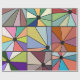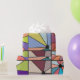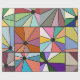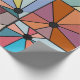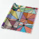 Este papel de embrulho tem um desenho abstrato que é feito de nove quadrados com um círculo e "raios" saindo do círculo em muitas cores diferentes.