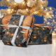 Papel de embrulho de dissociação com uma adorável raposa dormindo em frente a uma árvore de Natal na floresta.