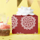 Esta mandala branca senta-se sobre um fundo vermelho escuro. A cor é profunda e quente. Parte da coleção Brosya Mandala.
