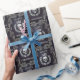Papel luxuoso e escuro envolvido em couro roxo, enfeitado com alivio prateado gótico real apresentando um ameaçador crânio prateado flanqueado por uma coroa de louros reluzente de folhas prateadas e finalmente uma gloriosa coroa prateada brilhando com uma luz pálida brilhante simbolizando uma antiga linhagem real. Perfeito para um Natal ou aniversário com tema real com um toque gótico real. O papel de embrulho perfeito para amantes de tudo o escuro e gótico, arcana, bruxaria e horror macabro.