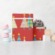 Wrap your holiday gifts with charm and color using this festive red Christmas wrapping paper. The repeating pattern features three whimsical Christmas trees with modern geometric, musical note, and polka dot designs—topped with golden stars on a rich red background.