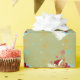 Bonita e fofa rena vermelha vestindo chapéu de Natal, cachecol e suéter. Ele está na floresta ao lado de um pinheiro branco pontilhado de estrelas e flocos de neve sobre fundo verde.