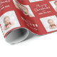 Christmas gift wrapping paper feature modern calligraphy merry Christmas and happy new year, family name typography, with personalized two photos in burgundy, red and white.