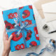 Legal plástico de presente impresso com um padrão desenhado à mão de carros de corrida de brinquedos vermelhos e capacetes de choque sobre um fundo azul brilhante