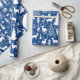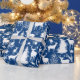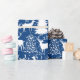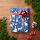 Papel de embrulho de inverno que apresenta um padrão de renas brancas numa floresta florestal de árvores em silhueta sobre fundo azul.