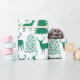 Papel de embrulho de inverno que apresenta um padrão de renas verdes numa floresta florestal de árvores em silhueta de cor branca.