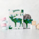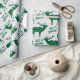 Para o amante da neve, este design de papel de embrulho de feriado apresenta um padrão de renas sobrepostas com flocos de neve verdes e azuis vibrantes e as palavras "Deixe-a nevar" espalhadas por toda parte. O fundo mostrado aqui é uma cinza de prata pálida.