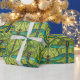 "Repeating dragonfly pattern on green wrapping paper, shown unrolled and flat. The design features teal dragonflies on vibrant green foliage."