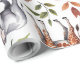 Repeating pattern of lions, giraffes, and elephants with green and orange leaves on white. The design is vibrant, conveying a playful, nature-inspired theme.