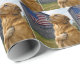 Um recuperador de ouros senta-se orgulhosamente em frente a um celeiro rústico, com uma bandeira americana pendurada nele e uma pata sobre seu coração