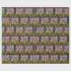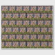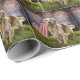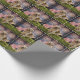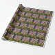Um recuperador de ouros parado na grama e segurando uma bandeira americana em sua boca contra um pano de fundo de um céu noturno iluminado por fogos de artifício coloridos