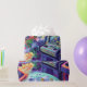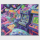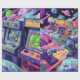 Retro arcade machines are nestled among vibrant planets and stars. The scene combines nostalgia with a colorful cosmic theme.