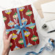 Este retrógrado festivo papel de embrulho de Natal é um vermelho profundo com ornamentos amarelos, verdes claros e verdes escuros.