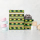 Os rinocerontes pretos e amarelos atravessam faixas verdes alternando com faixas vagamente "tecidas" em cores africanas de vermelho, preto e verde com sotaques amarelos.