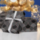 Caixa de favores elegante com padrão branco e cinza com acentos de ouro rosa.
