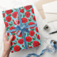 Design sem costura apresentando rosas vermelhas florescentes com caules e folhas verdes contra um pano de fundo azul macio, criando uma estética floral ousada e elegante para várias aplicações design e decorativas.