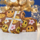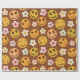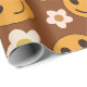 Este é um rostos alegres e cor de laranja e amarelo sorridente com flores retrorreflectoras em fundo castanho escuro.