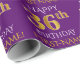 Este design de papel de embrulho apresenta uma mensagem como "FELIZ 36º ANIVERSÁRIO", com o "36º" a ter uma aparência falsa/imitação de ouro. Ele também apresenta um nome personalizado e um fundo de cor roxa. Talvez possa ser utilizado quando se dá presentes para o trigésimo sexto aniversário de alguém. [~Z0000134]