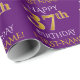 Este design de papel de embrulho apresenta uma mensagem como "FELIZ 37º ANIVERSÁRIO", com o "37º" a ter uma aparência falsa/imitação de ouro. Ele também apresenta um nome personalizável e um fundo de cor roxa. Talvez possa ser utilizado quando se dá presentes para o trigésimo sétimo aniversário de alguém. [~Z0000134]