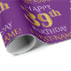 Este design de papel de embrulho apresenta uma mensagem como "FELIZ 39º ANIVERSÁRIO", com o "39º" a ter uma aparência falsa/imitação de ouro. Ele também apresenta um nome personalizável e um fundo de cor roxa. Talvez possa ser utilizado quando se dá presentes para o trigésimo nono aniversário de alguém. [~Z0000134]