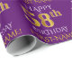 Este design de papel de embrulho apresenta uma mensagem como "FELIZ 58º ANIVERSÁRIO", com o "58º" a ter uma aparência falsa/imitação de ouro. Ele também apresenta um nome personalizado, e um fundo de cor roxa. Talvez possa ser utilizado quando se dá presentes para o quinquagésimo oitavo aniversário de alguém. [~Z0000134]