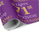 Este design de papel de embrulho apresenta uma mensagem como "FELIZ 71rua ANIVERSÁRIO", com a "71ruas" com aparência falsa/imitação de ouro. Ele também apresenta um nome que pode ser personalizado e um fundo de cor roxa. Talvez possa ser utilizado quando se dá presentes para o 71º aniversário de alguém. [~Z0000134]
