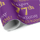 Este design de papel de embrulho apresenta uma mensagem como "FELIZ 77º ANIVERSÁRIO", com o "77º" a ter uma aparência falsa/imitação de ouro. Ele também apresenta um nome personalizável e um fundo de cor roxa. Talvez possa ser utilizado quando se dá presentes para o setenta e sete anos de alguém. [~Z0000134]